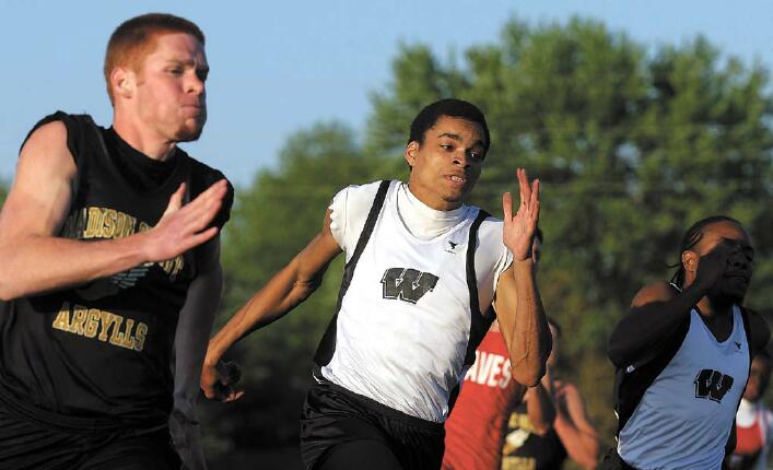 ![]() Western sprinters: Western juniors Jerel Hall, center, and Kyle Brown, right, come out of the turn in the 200-meter dash final during the Kokomo Track and Field Sectional Friday night at Walter Cross Field. Hall won the event and Brown finished in third place. KT photo |